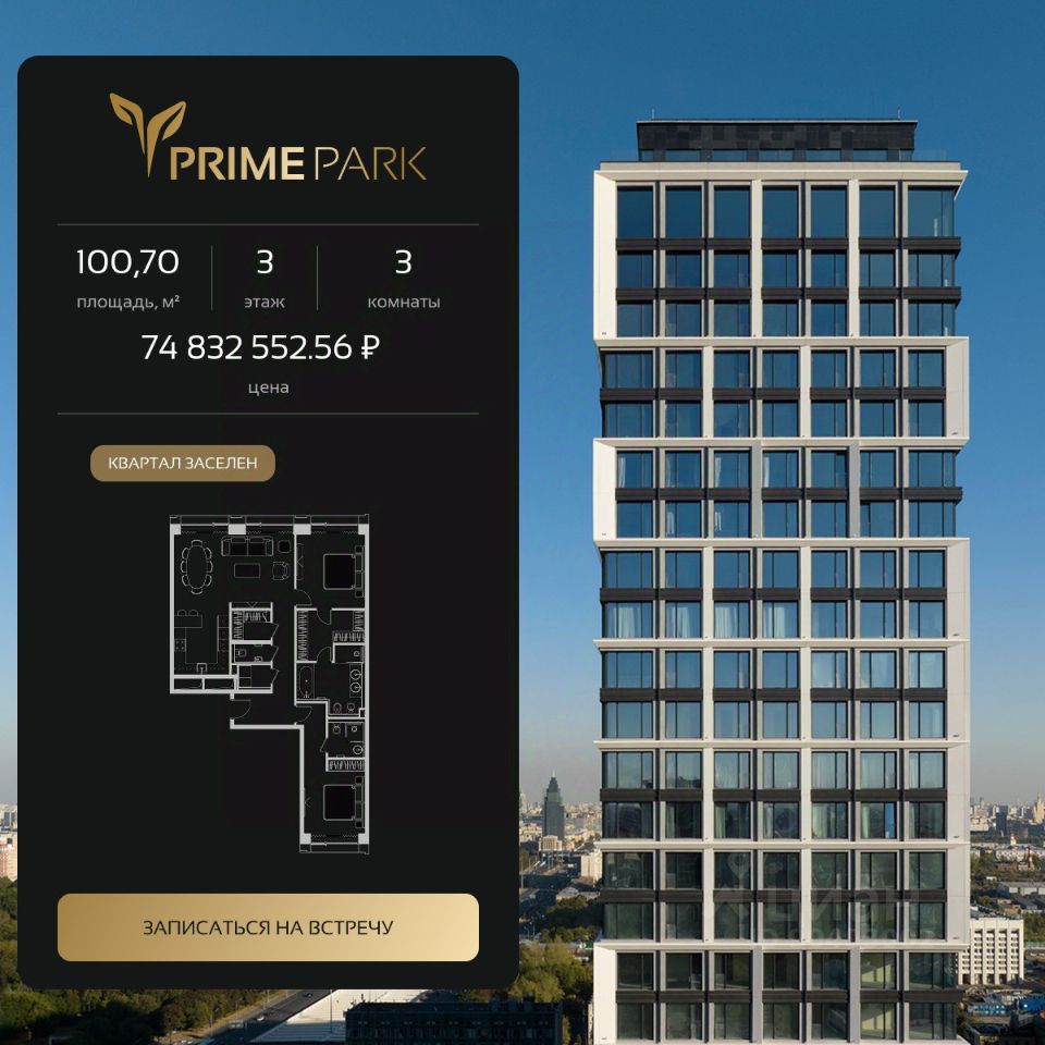 Жилой квартал Prime Park воплощает все преимущества premium-living. Престижная локация на Ленинградском проспекте, 37: - 5 мин. от Тверской улицы, Патриарших прудов и Белой площади, - 20 мин. до аэропорта "Шереметьево" или "Москва-Сити", - 4 парка — Ходынское поле, Петровский и Чапаевский парки, Березовая роща, - 4 станции метро — "ЦСКА", "Аэропорт", "Динамо" и "Петровский парк". Многократный победитель премий European Property Awards и Urban Awards, а также на протяжении пяти лет остается самым продаваемым проектом в своем сегменте. Premium-living Консьержи предугадывают желания резидентов и берут на себя выполнение практически любых бытовых задач. В квартале также есть парк-рейнджер и охрана. Для дополнительного удобства в МОПах предусмотрены почтовые комнаты, колясочные и комнаты для мытья лап домашних питомцев, комната для хранения интернет-заказов. Наличие сервисного входа для персонала позволяет разделить трафик, сохраняя приватную атмосферу в лобби. Резидентам нужно открыть только одну дверь, чтобы оказаться дома: valet-парковщики открывают дверь автомобиля и отвозят его на подземный паркинг, беллмены открывают двери при входе в башню и помогают донести вещи до квартиры, интеллектуальная система обеспечивает бесконтактный вызов лифта. Развитая инфраструктура Близость к центру Москвы, рядом крупнейший ТЦ "Авиапарк", ВТБ Арена, Мегаспорт, ВЭБ Арена, в окружении красивейших парков, включая ультрасовременный Ходынский парк площадью 25 га с панорамными качелями, набережной, фонтанами, детскими и спортивными площадками. На территории квартала предусмотрены приватный фитнес-центр с 25-метровым бассейном и спа, подземный паркинг с кладовыми, местами для хранения велосипедов, электрозарядками и детейлинг-центром для обслуживания автомобилей. На первых этажах башен расположатся кафе и рестораны, цветочный магазин, аптека, салон красоты, премиальный супермаркет и бытовые сервисы. Частный парк Общее парковое пространство квартала — 5,5 га, из них 3 га отведено под частный парк эксклюзивно для резидентов. Большой фонтан, аллеи для прогулок, крупномерные деревья, арт-инсталляции, водные глади, детские площадки и воркаут-зона создают гармоничное сочетание жизни на природе со всеми преимуществами мегаполиса. Уникальная квартирография Более 80 вариантов планировочных решений от однокомнатных квартир до двухуровневых дуплексов и пентхаусов. Панорамные окна, высокие потолки, мастер-спальни, балконы и террасы создают особенный комфорт и уют. Авторская архитектура и дизайн Четыре башни сданы, ключи выдаются в день сделки, 2 башни на этапе строительства, сдача в 2023 и 2024 гг. Уникальный архитектурный ансамбль и ландшафтный дизайн, благородные и ценные материалы в оформлении лобби, предметы искусства, арт-объекты и элементы декора, выполненные на заказ специально для Prime Park, становятся отражением яркой индивидуальности резидентов квартала.