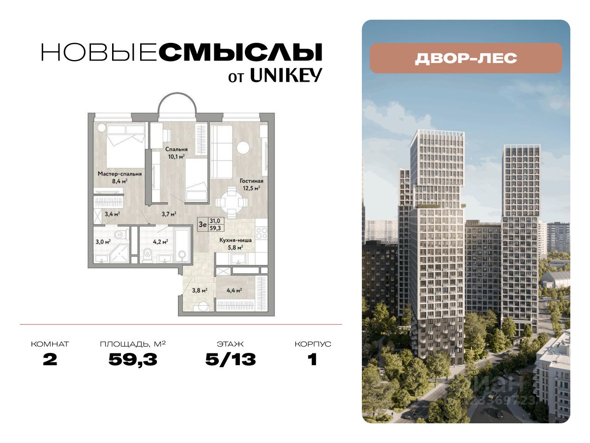 В жилом комплексе, расположенном по соседству с ландшафтным парком "Южное Бутово", продается 2-комнатная квартира площадью 59.30 кв. м. с отделкой. Квартира расположена на 5 этаже 1 корпуса в жилом квартале комфорт-класса "Новые Смыслы от UNIKEY" (ГК Unikey/Юникей).