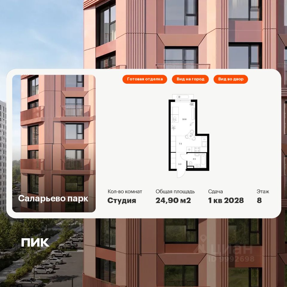 Продаётся квартира-студия площадью 24,9 кв.м на 8 этаже 18 этажного дома (Корпус 74.1, Секция 1) проекта ПИК Саларьево парк. Светлый просторный подъезд на уровне земли, функциональная планировка, большие окна, c отделкой.