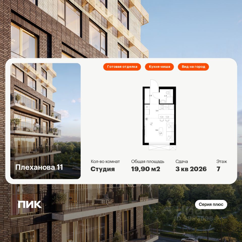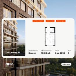 Продаётся квартира-студия площадью 19,9 кв.м на 7 этаже 24 этажного дома (Корпус 1.4, Секция 4) проекта ПИК Плеханова 11. Светлый просторный подъезд на уровне земли, функциональная планировка, большие окна, c отделкой.
