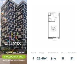 Продаётся студия в строящемся доме (Корпус 4), срок сдачи: III-кв. 2026, общей площадью 23.41 кв.м., на 11 этаже.