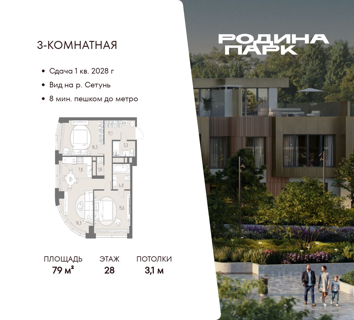 В жилом кластере Родина Парк рядом с природным заказником Долина реки Сетунь продаётся 3-комнатная квартира.