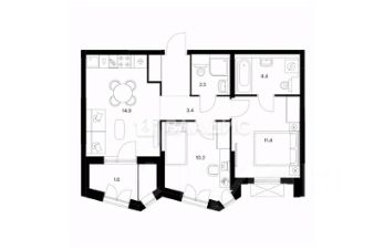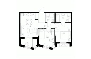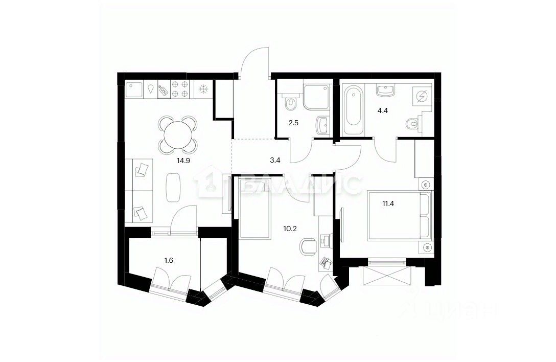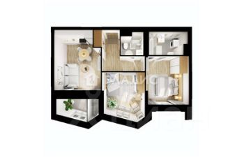 Планировка включает: кухню-гостиную, 2 изолированные спальни, прихожая, 2 санузла.