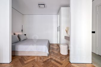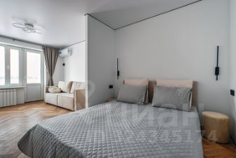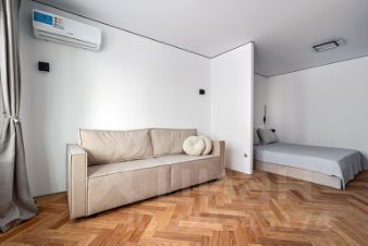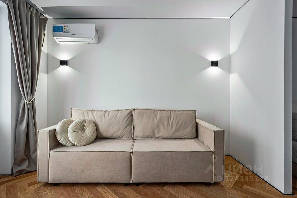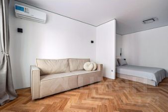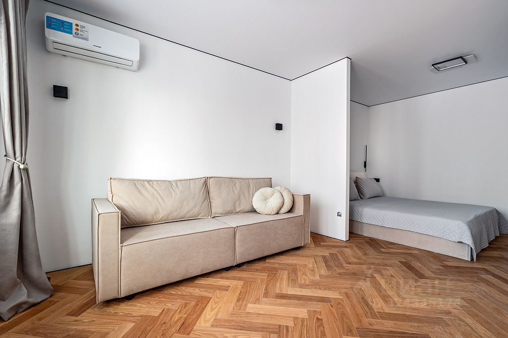 Есть отдельная спальня 10м2 за перегородкой и гостиная 12м2, кухня 6м2. Установлен раскладной диван, кровать с подъемным механизмом, шкафы для одежды , дизайнерский стол и стулья, кухня с техникой (посудомоечная машина, варочная газовая панель, духовой шкаф, встроенный холодильник, вытяжка).
