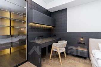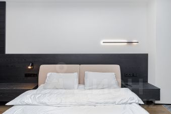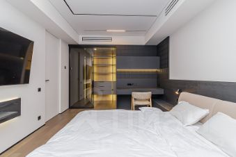 - в спальне продумано скрытое вечернее освещение, предусмотрено рабочее место, кровать с подъемным механизмом и своя гардеробная, находящаяся за тонированным закаленным стеклом (предусмотрены плавные доводчики на открытие и закрытие);