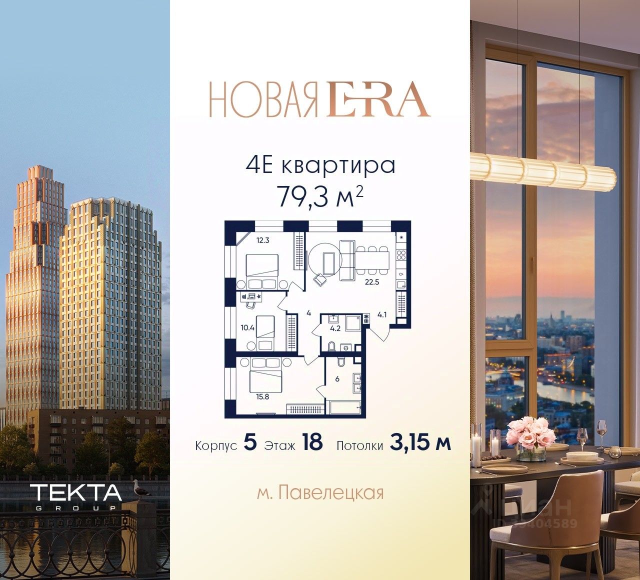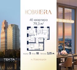 4-комн. квартира в ЖК "Era" на 18 этаже в 52 этажном здании Корпус 5. Общая площадь: 79.3 кв.м., жилая: 54.30 кв.м. Высота потолков 3.15 м.