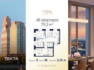 4-комн. квартира в ЖК "ЭРА" на 18 этаже в 52 этажном здании Корпус 5. Общая площадь: 79.3 кв.м., жилая: 54.30 кв.м. Высота потолков 3.15 м.