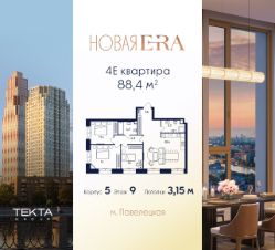 4-комн. квартира в ЖК "Era" на 9 этаже в 52 этажном здании Корпус 5. Общая площадь: 88.4 кв.м., жилая: 58.90 кв.м. Высота потолков 3.15 м.