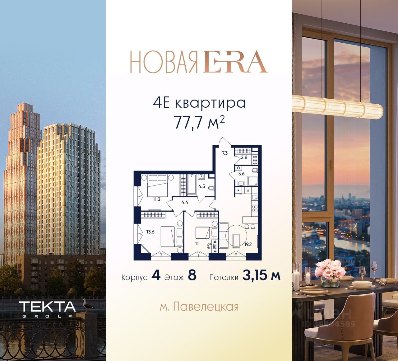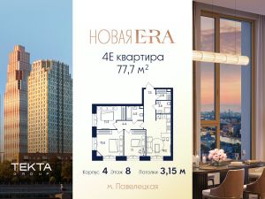 4-комн. квартира в ЖК "Era" на 8 этаже в 43 этажном здании Корпус 4. Общая площадь: 77.7 кв.м., жилая: 49.60 кв.м. Высота потолков 3.15 м.