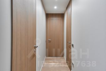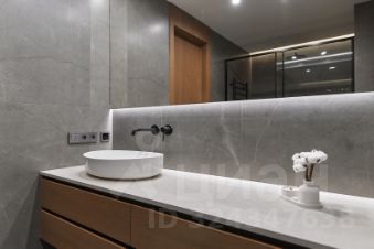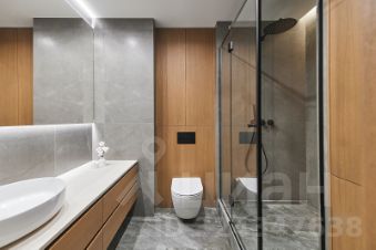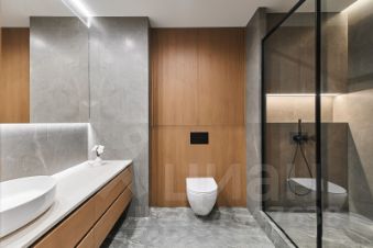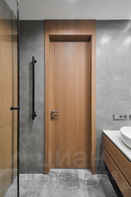 Мебель изготовлена по индивидуальному проекту компанией Domani из шпона дуба + керамогранит Inalco (премиум Испания). Двери изготовлены компанией Lazio. Паркет на полу. В сан/узле + пол керамогранит, фуга эпоксидная, сантехника встроенная, инсталляция TECE (Германия), встроенный трап в плитку.