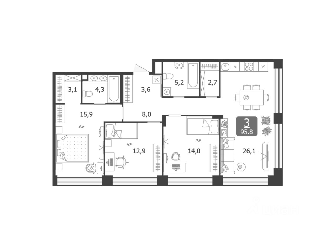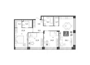 Площадь комнат - 15.9-14-14-12.9м.кв.