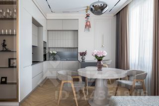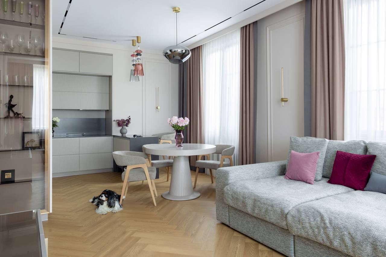 Кухня-гостиная: Сердце квартиры, где собирается вся семья. Свободное пространство объединяет кухонный гарнитур, обеденную группу и зону для отдыха с мягким диваном. Идеальное место для вечерних посиделок с близкими и приема гостей.