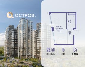 Продаётся студия от застройщика: общая площадь 28.50 м², жилая 10.00 м², кухня 9.30 м², 15, жилой квартал "Остров 12", корпус 3 (12.1 квартал) (секция 1). срок сдачи: 4-кв. 2025.
