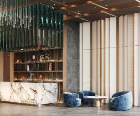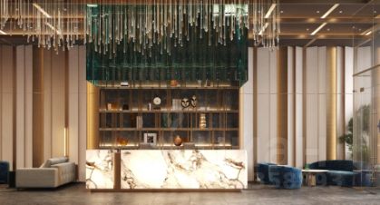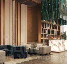 расположен парадный холл с декоративным освещением, лаунж-зоной, детской игровой комнатой и колясочной.