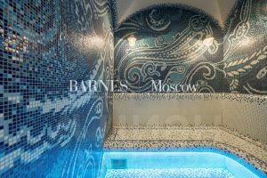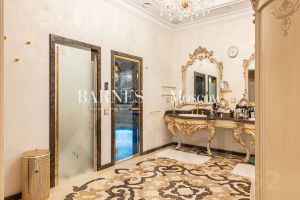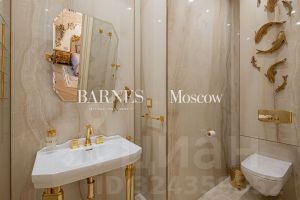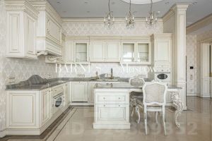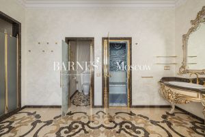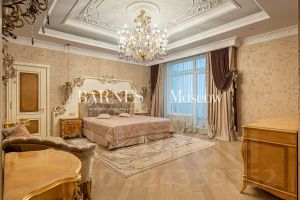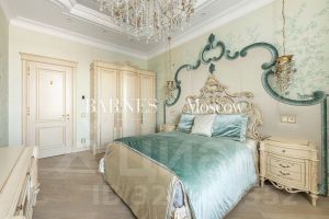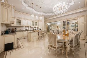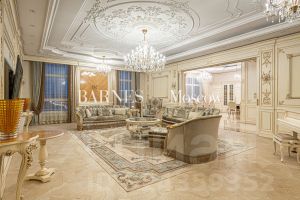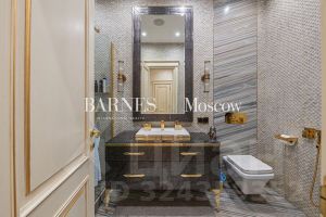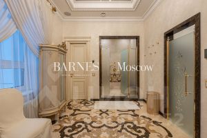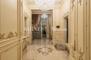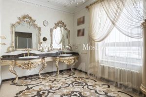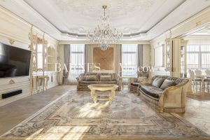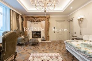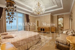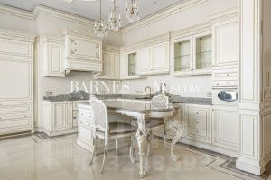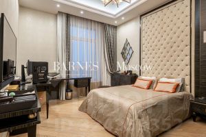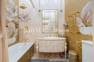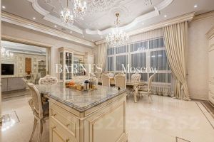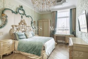 Выполнена авторская отделка в классическом стиле с использованием дорогостоящих материалов (натуральный мрамор, дубовый пол, шелковые обои). Продуманный до мелочей интерьер дополнен мебелью, изготовленной на заказ, и техникой премиальных брендов.