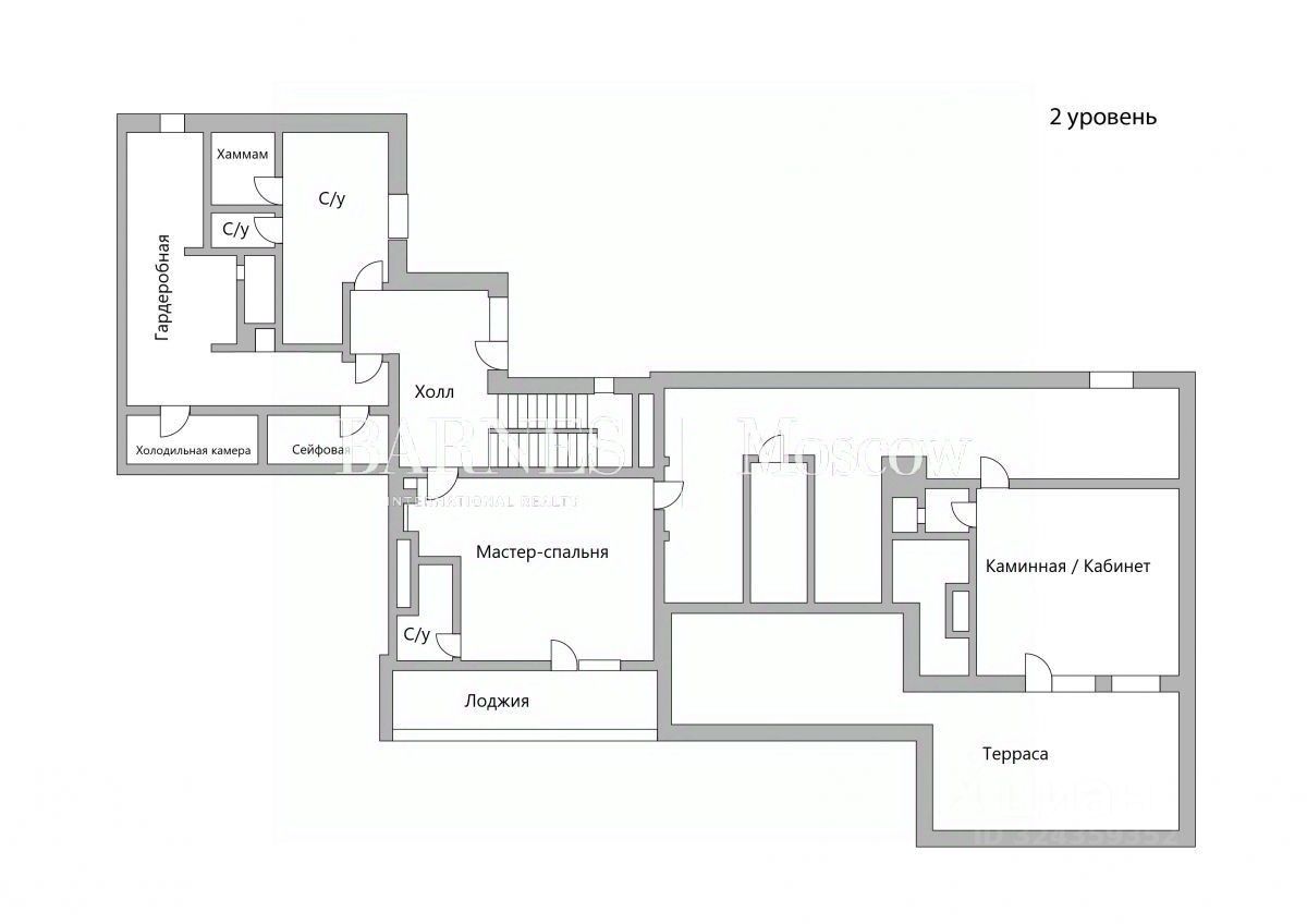 2 уровень - каминный зал, мастер-спальня с санузлом, сейфовая, гардеробная, холодильная камера, 2 санузла, хаммам, 2 лоджии.