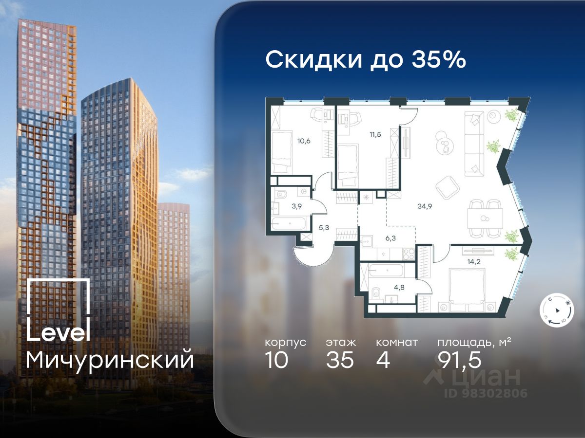 В жилом квартале, расположенном на границе с природным заказником "Долина реки Очаковки", продаётся 4-комнатная квартира площадью 91.50 кв.м с отделкой white box. Квартира расположена на 35 этаже 42-этажного корпуса 10 в жилом комплексе бизнес-класса Level Мичуринский (компания Level Group/Левел групп).