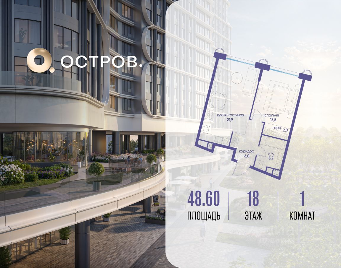 Продаётся однокомнатная квартира от застройщика: общая площадь 48.60 м², жилая 13.50 м², кухня 21.90 м², 18, жилой квартал "Остров 7", корпус 7 (7 квартал) (секция 2). срок сдачи: 4-кв. 2025.