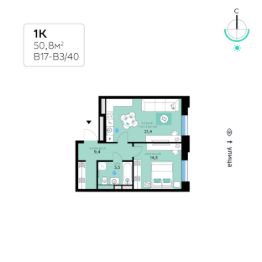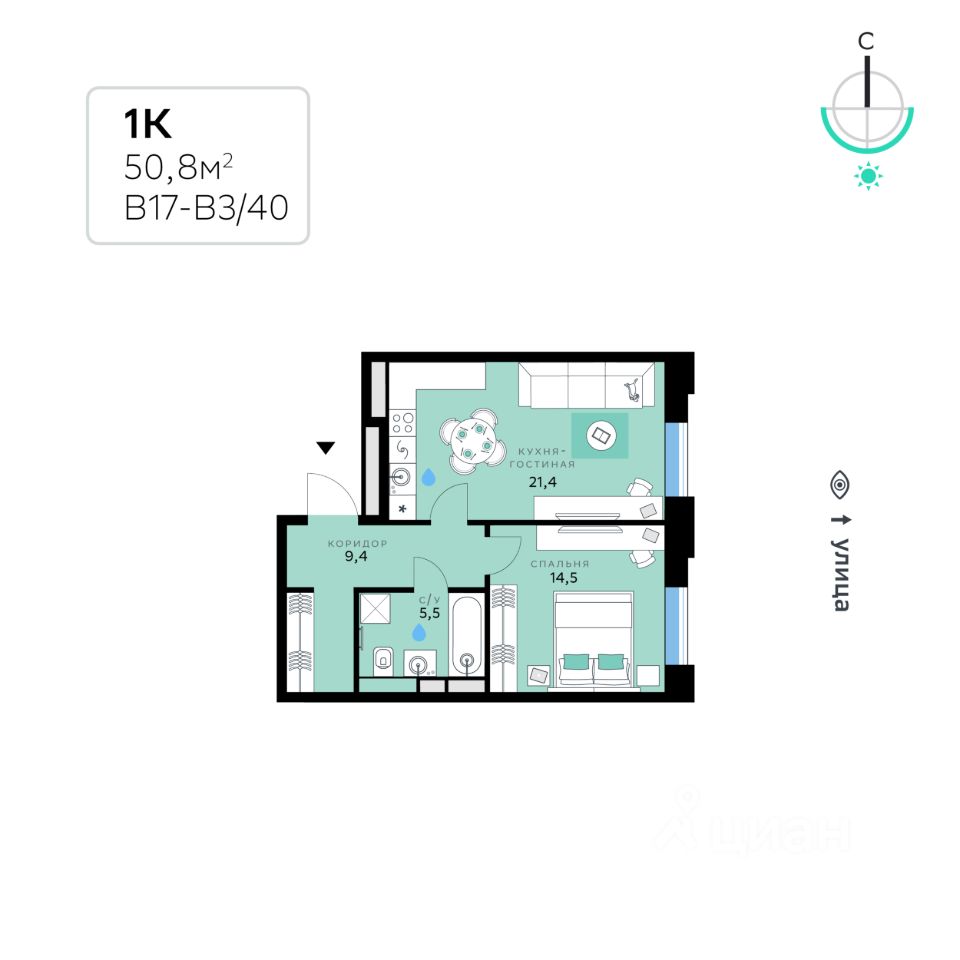 В продаже — однокомнатная квартира, общей площадью 50,8 кв. м. Квартира расположена на пятом этаже шестиэтажного корпуса класса Балансд в квартале В17 нового района СберСити, который строит Сбер.