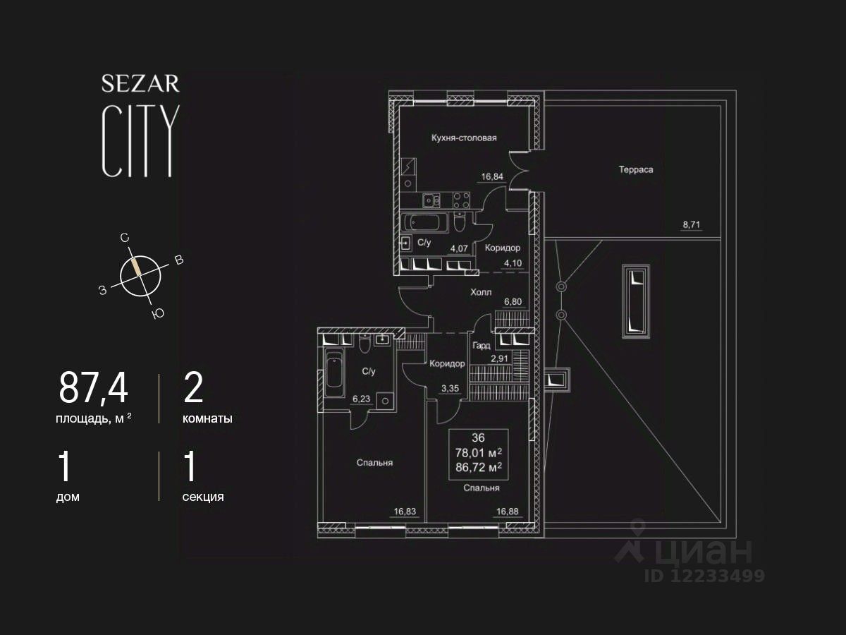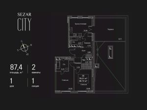 Продается 2-комнатная квартира в ЖК SEZAR CITY на 9 этаже. Общая площадь квартиры составляет 87,4 кв.м. Квартира без отделки. Срок сдачи - 2027 год.