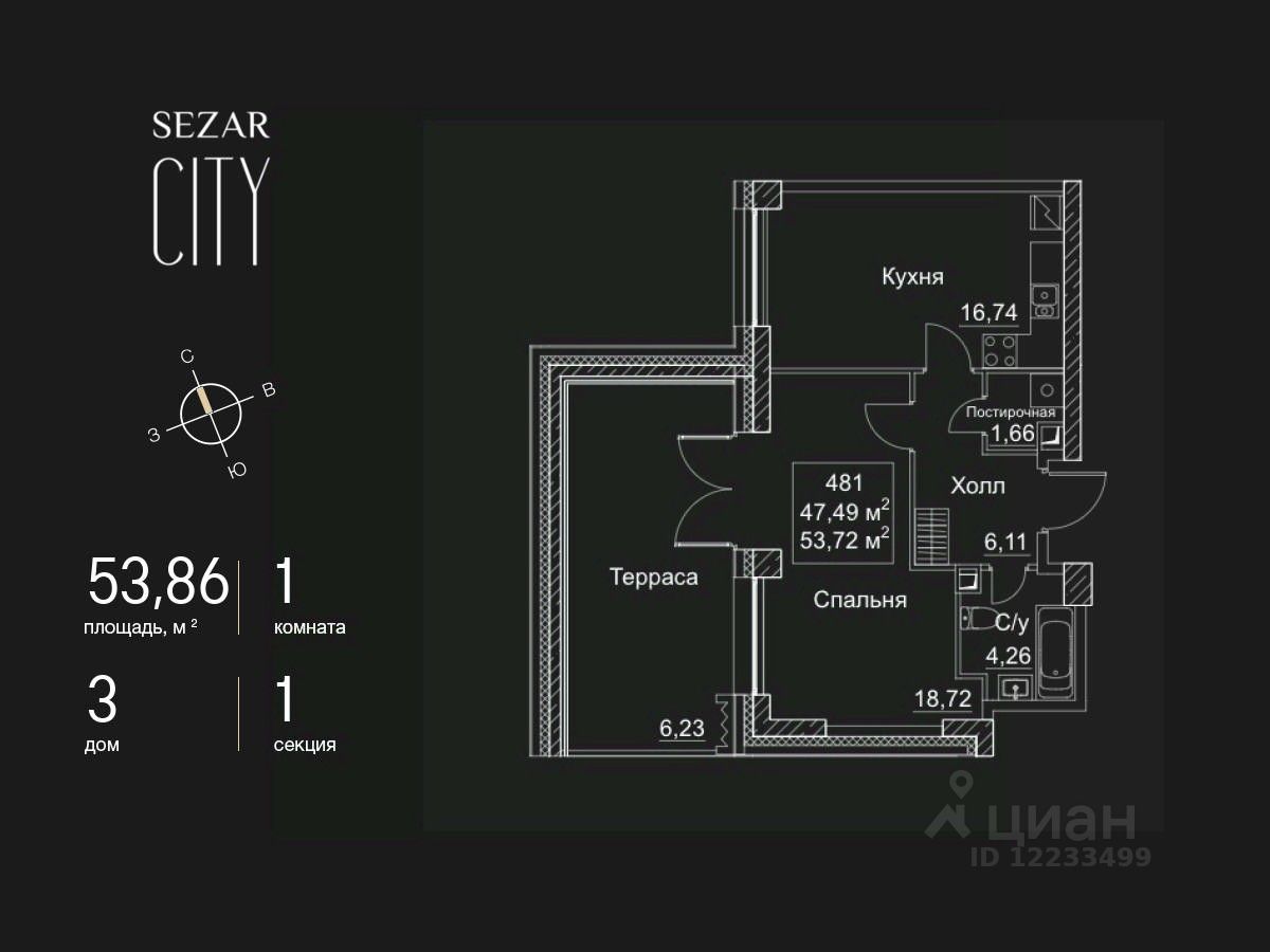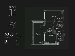 Продается 1-комнатная квартира в ЖК SEZAR CITY на 46 этаже. Общая площадь квартиры составляет 53,86 кв.м. Квартира без отделки. Срок сдачи - 2027 год.