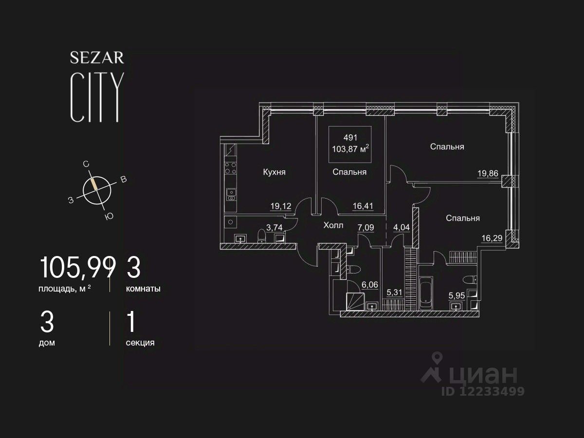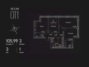 Продается 3-комнатная квартира в ЖК SEZAR CITY на 47 этаже. Общая площадь квартиры составляет 105,99 кв.м. Квартира без отделки. Срок сдачи - 2027 год.