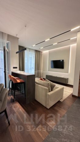 кухня-гостиная с балконом, две спальни (в одной из которых есть балкон), санузел с душевой, гостевой санузел, удобный просторный холл.Квартира очень уютная, имеет сдержанные благородные цвета в отделке и дорогостоящие материалы. Потолки 3,1 м, широкоформатные окна Schuko, из которых открываются виды на гостиницу "Украина", парк "Красная Пресня" и на благоустроенную территорию.