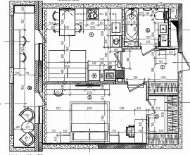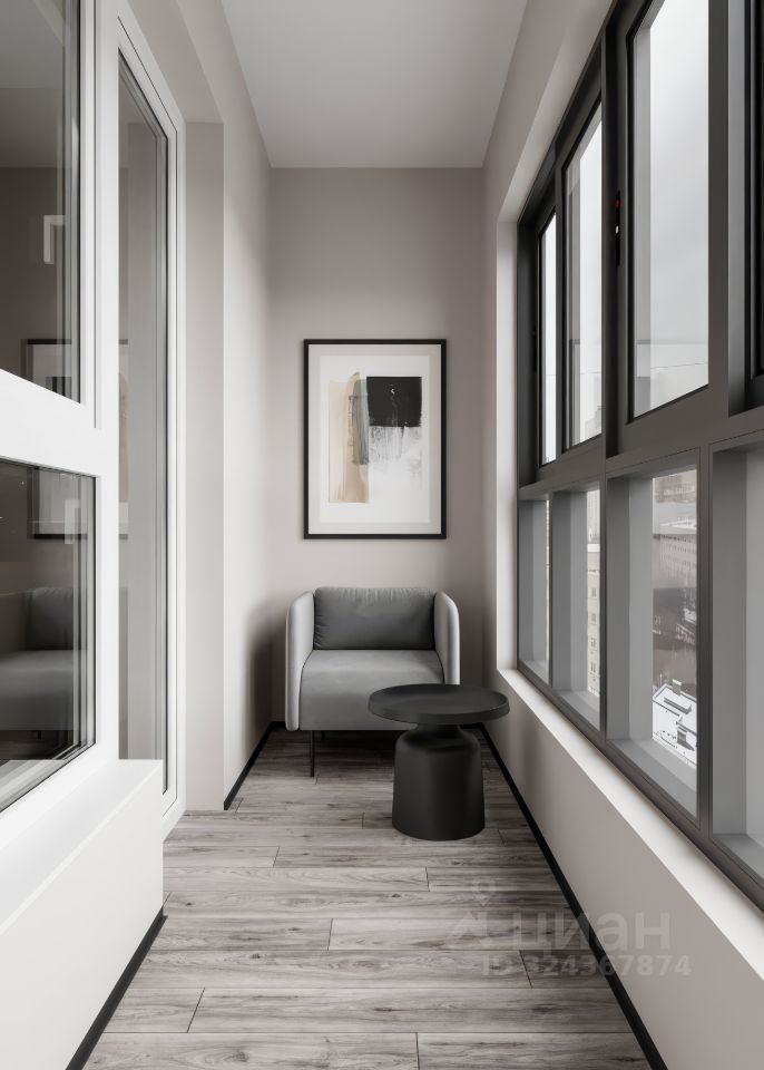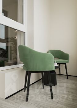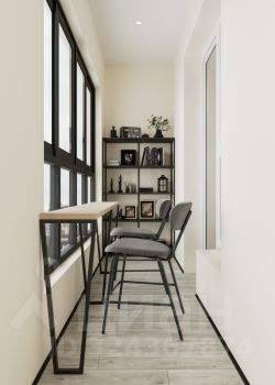 - На лоджии: стеллаж, полубарный столик, выполнены под заказ, барные стулья, 2 кресла, журнальный столик,