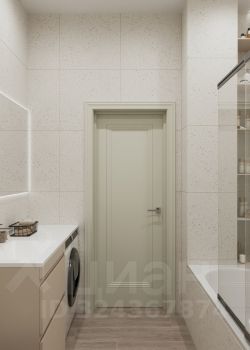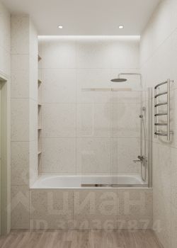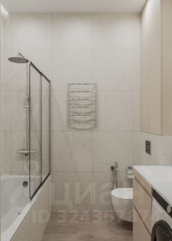 - В Ванной комнате: акриловая ванна, душевая система, гигиенический душ, смесители, стеклянная шторка на ванну, полотенцесушило, зеркало с подсветкой, тумба со встроенной раковиной, подвесной унитаз, дверки над коробом с инсталляцией, проточный обогреватель, стиральная машина,