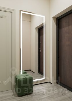 В коридоре: шкаф для вещей, выполненный по индивидуальному проекту, зеркало с подсветкой, пуф.