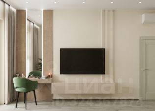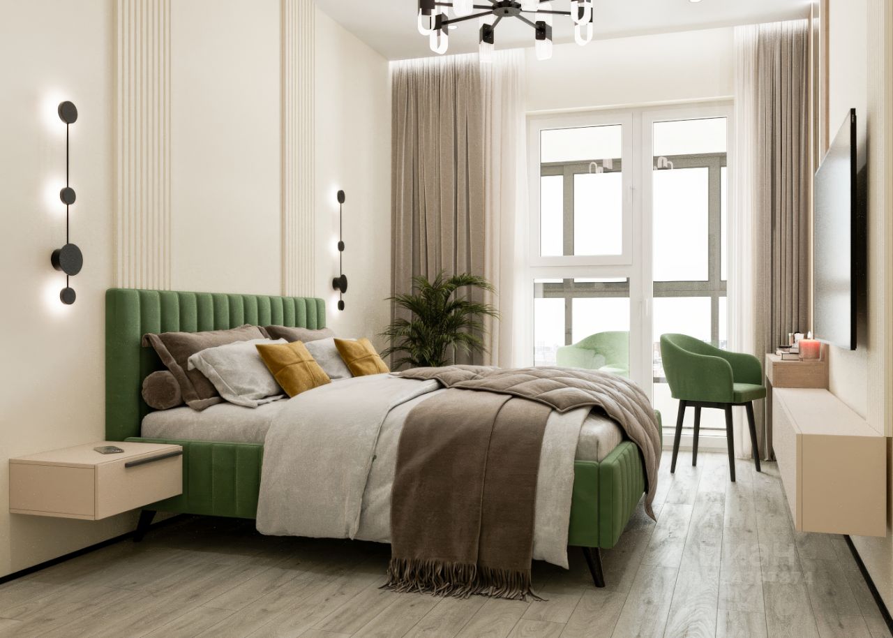- В спальне: кровать (180), две подвесные тумбочки, подвесная тумба, консольная тумба, выполнены по индивидуальному проекту, зеркало, мягкий стул, телевизор, шторы, письменный стол и мягкий стул, бра,