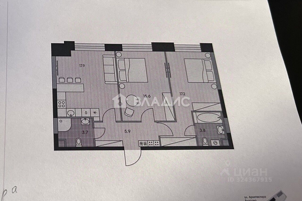 Общая площадь квартиры — 64,1 кв. м, кухня — 17,9 кв. м. Высота потолков 4 метра создаёт ощущение простора. Два совмещённых санузла обеспечивают удобство для всех членов семьи.