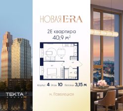 2-комн. квартира в ЖК "Era" на 10 этаже в 43 этажном здании Корпус 4. Общая площадь: 40.9 кв.м., жилая: 25.50 кв.м. Высота потолков 3.15 м.