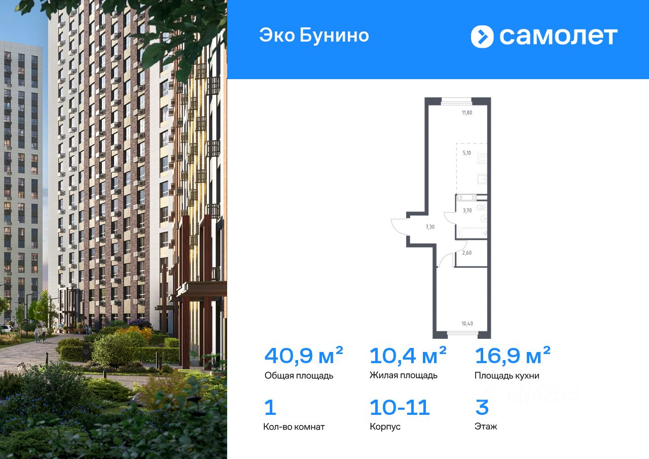 Строим кварталы для жизни с заботой о будущем. Предлагается 1-комнатная квартира комфорт-класса 40,9 кв.м в корпусе 10-11 на 3 этаже, в ЖК "Эко Бунино"