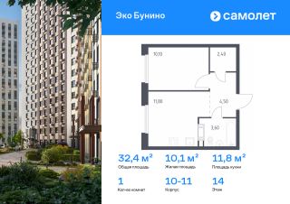 Строим кварталы для жизни с заботой о будущем. Предлагается 1-комнатная квартира комфорт-класса 32,4 кв.м в корпусе 10-11 на 14 этаже, в ЖК "Эко Бунино"