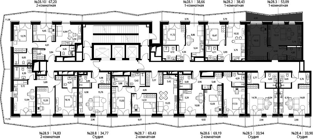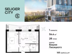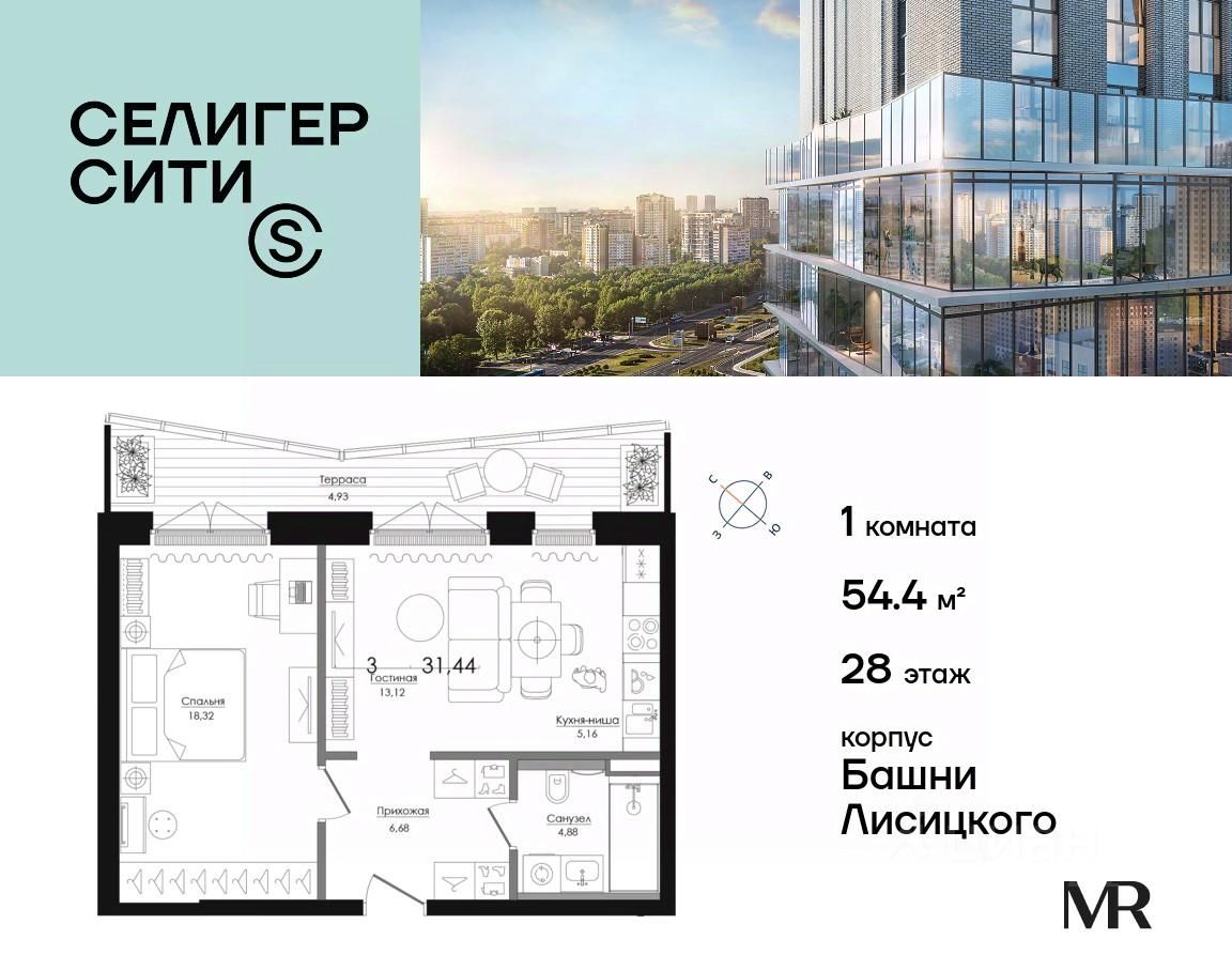 Продаётся 1-комнатная квартира общей площадью 54.42 м² без отделки в ЖК "Селигер Сити" на 28-м этаже башни Лисицкого.