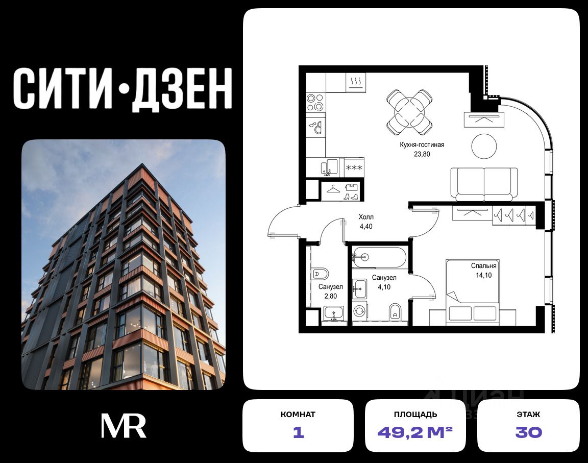 Продается 1-комнатная квартира от застройщика в жилом мультиквартале СИТИДЗЕН на 30-м этаже в корпусе #1. Общая площадь лота составляет 49.20 м²