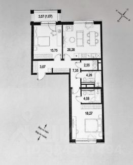 Квартира окнами на две стороны, с большой кухней гостиной, двумя санузлами.