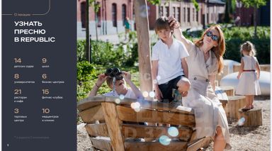 ЖК премиум-класса Republic - новый символ Пресни. 10 жилых башен и 4 восстановленных здания локомотивного депо образуют уникальное пространство. В проекте уникальная инфраструктура: гастрономический центр (типо Депо), торговая галерея с магазинами, большой фитнес со SPA-комплекс с бассейном, детский сад, множество коммерческих помещений в первых этажах. Собственный бульвар и яркие арт-пространства — для жителей предусмотрены все элементы премиального комфорта. 6 га внутренней территории с ландшафтным дизайном, открытая терраса на крыше лобби с кафе на свежем воздухе