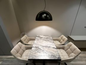 Кварцвинил по всей квартире. Стены и потолки из ГКЛ под покраску, цвет тауп, краска моющаяся. Тёплый пол в прихожей. Встроенная мебель. Кровать Askona с местом хранения. Заказной раскладной стол и стулья. Шторы блэкаут, металлические карнизы. Итальянская люстра, регулируемое освещение, много сценариев света. Двери скрытого монтажа ProfilDoors, теневые профили.