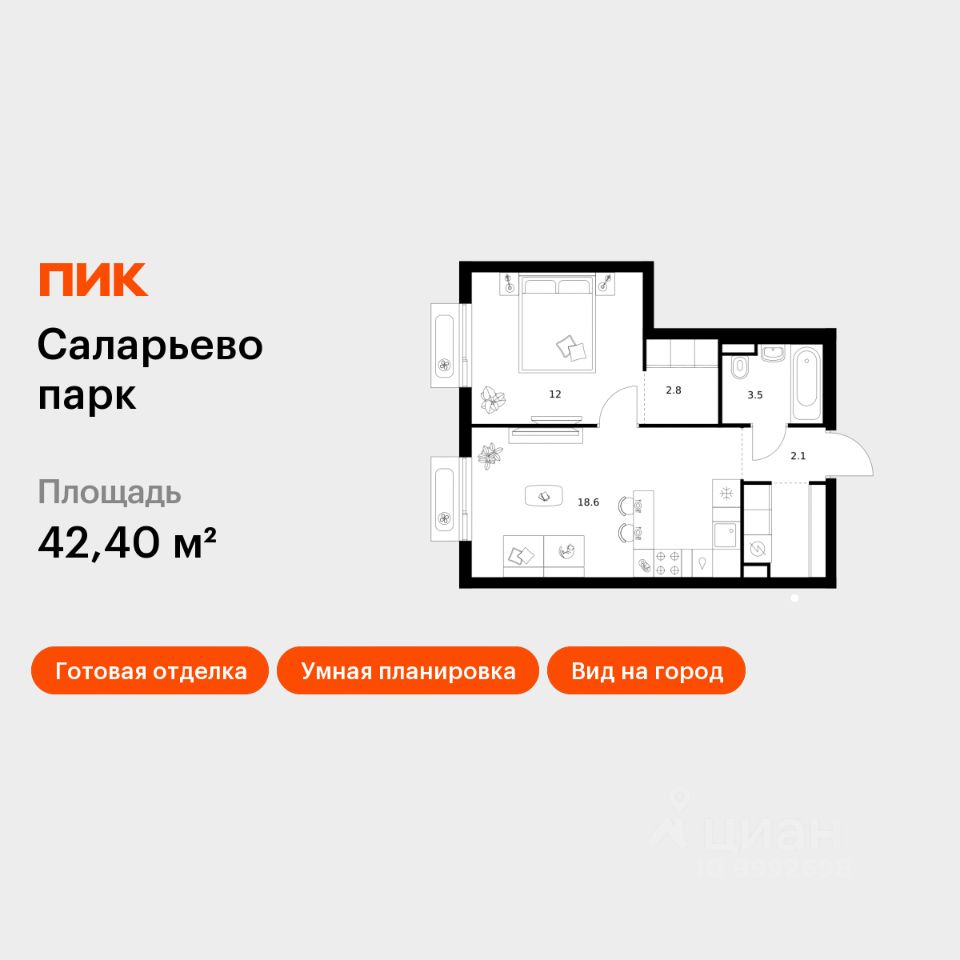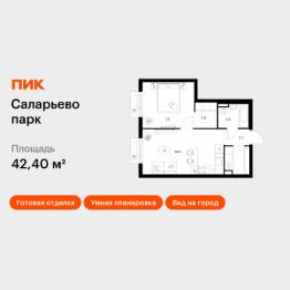 Продаётся 1-комн. квартира площадью 42,4 кв.м на 9 этаже 18 этажного дома (Корпус 74.9, Секция 9) проекта ПИК Саларьево парк. Светлый просторный подъезд на уровне земли, функциональная планировка, большие окна, c отделкой.