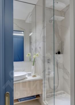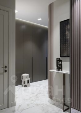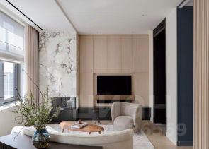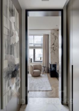 На пол уложен дубовый штучный паркет, в отделке использован мрамор Breccia Capraia, латунь, вся встроенная мебель на заказ - Квинтон.