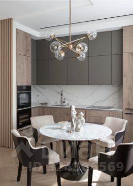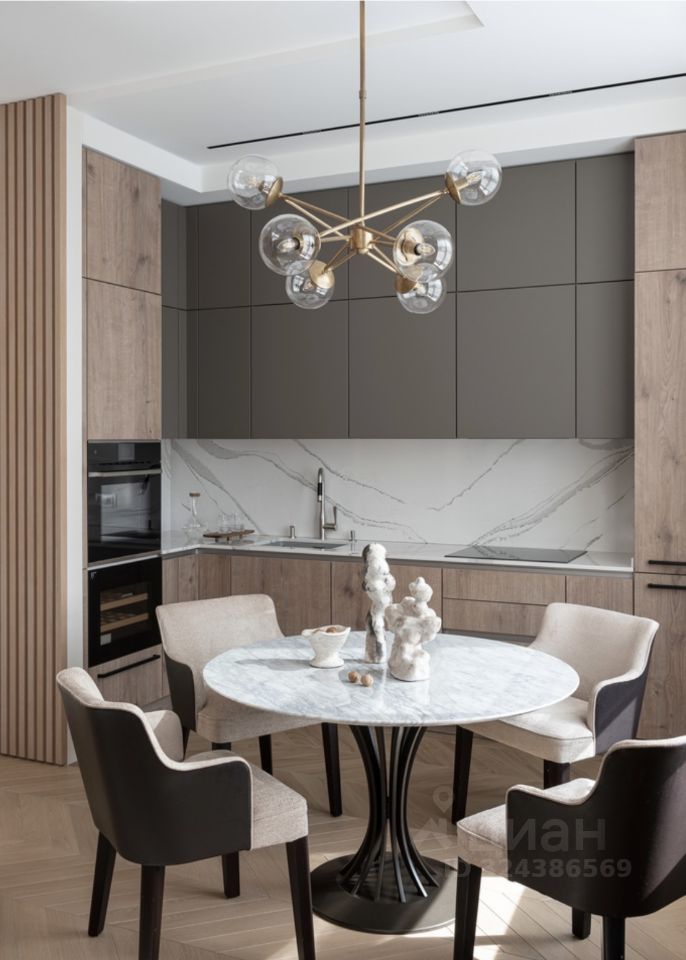 Кухня Nolte со всей необходимой премиальной встроенной бытовой техникой, обеденный стол со столешницей из каррарского мрамора и стулья от Casamilano.