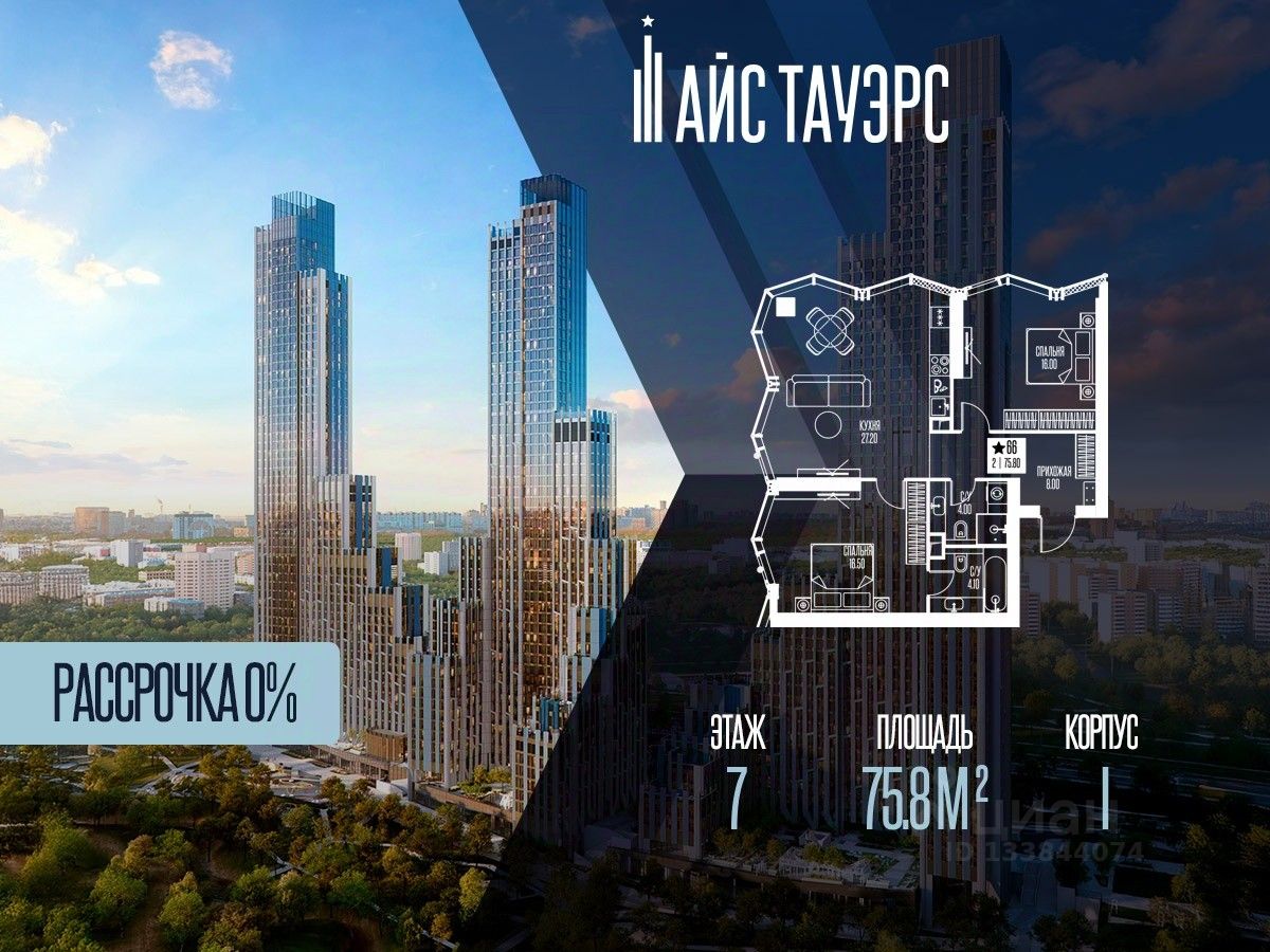 Беспроцентная рассрочка от застройщика. Продается 2-комнатная квартира на 7 этаже, 75.8 кв.м. площади в жилом комплексе "Айс Тауэрс", который расположен в Западном административном округе Москвы. Архитектура комплекса отличается панорамным остеклением фасадов.