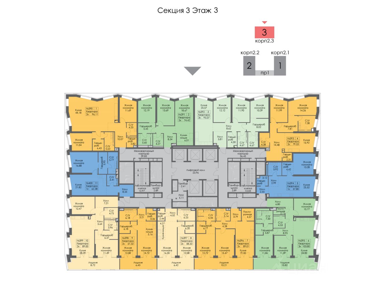 Квартира расположена в корпусе 2.3, в секции 3, на 3 этаже.