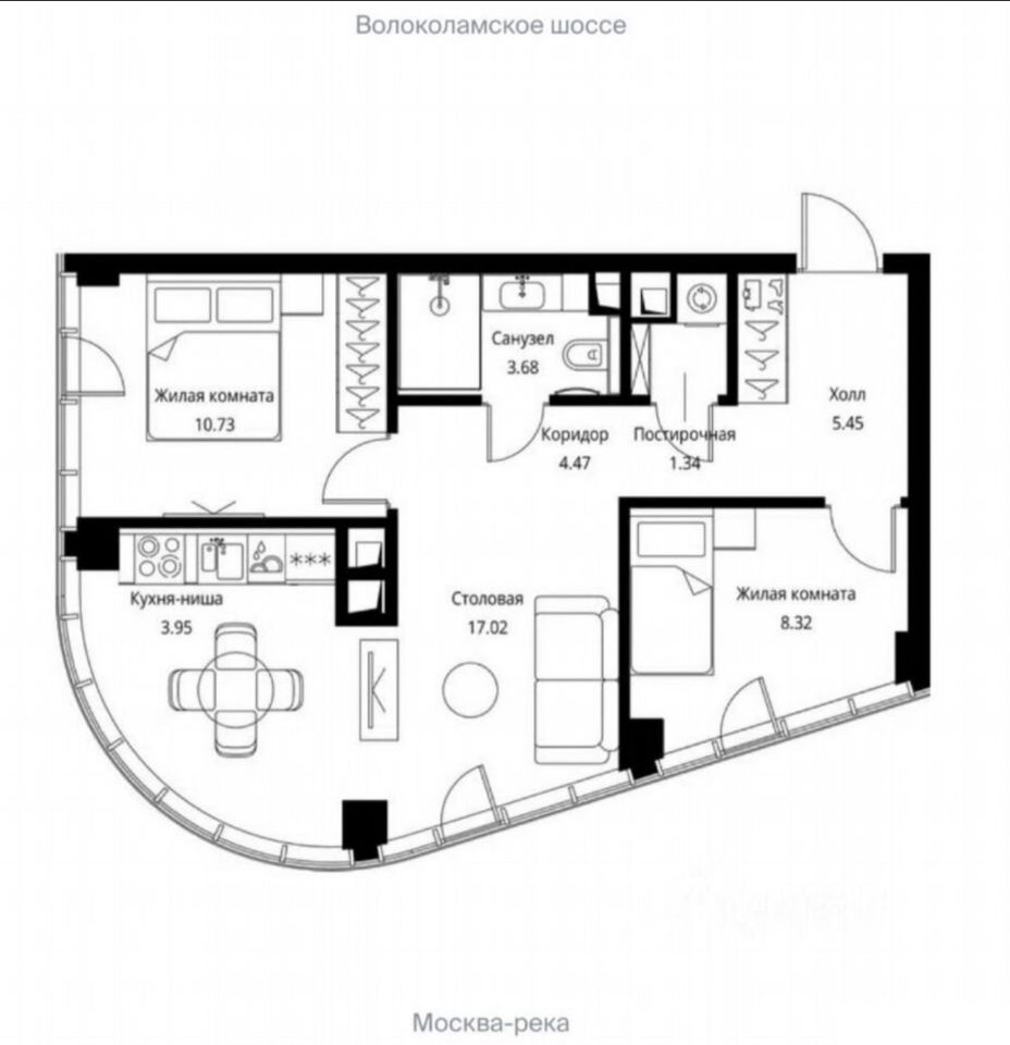 Общая площадь 54.3 м2 . Кухня гостиная 21м2. Две изолированные комнаты. Сан узел . Гардеробная. Панорамные высокие окна.
