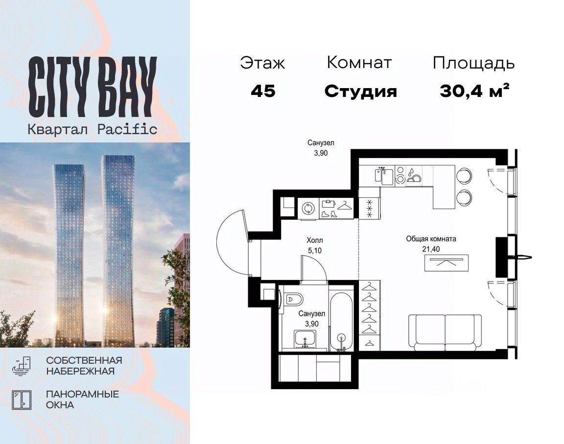 Продаётся студия общей площадью 30.40 м² без отделки в ЖК City Вау, квартале Pacific, на 45-м этаже 47 этажного дома.