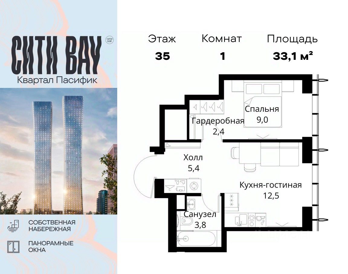 Продаётся 1-комнатная квартира общей площадью 33.10 м² без отделки в ЖК Сити Бэй, квартале Пасифик, на 35-м этаже 59 этажного дома.