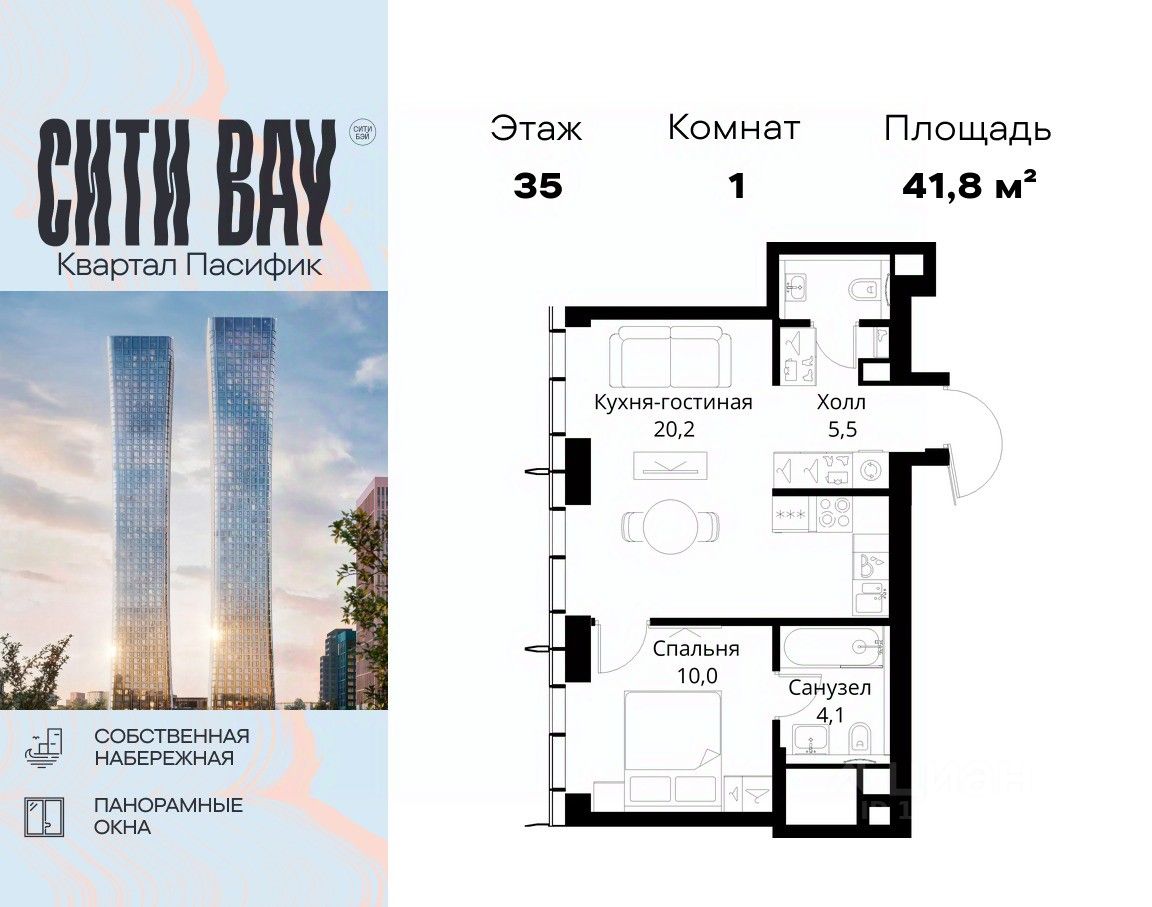 Продаётся 1-комнатная квартира общей площадью 41.80 м² без отделки в ЖК Сити Бэй, квартале Пасифик, на 35-м этаже 59 этажного дома.