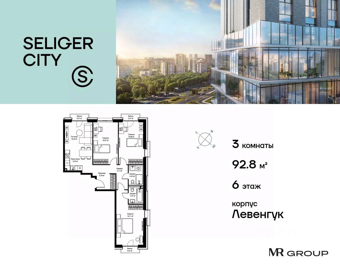 Продаётся 3-комнатная квартира общей площадью 92.82 м² без отделки в ЖК "Селигер Сити" на 6-м этаже 21 этажного дома.
